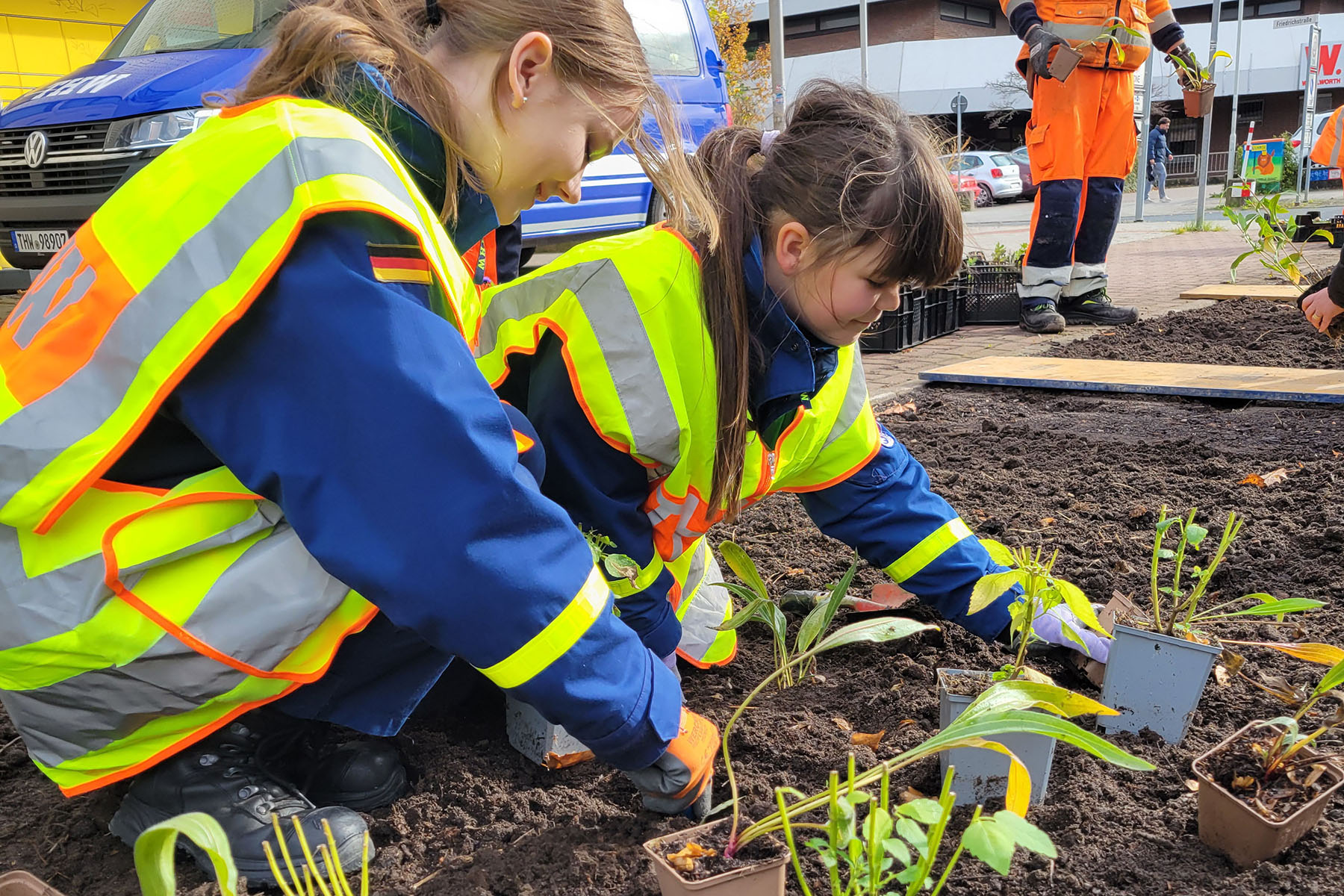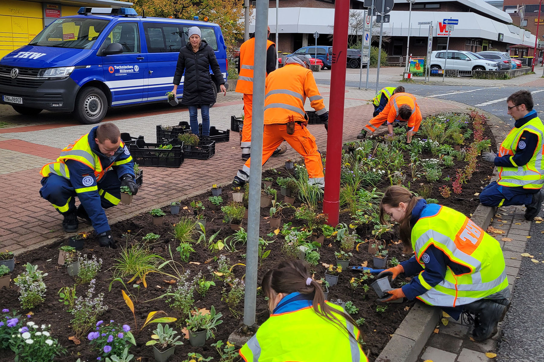 Mit viel Engagement und Herzblut hat die THW-Jugend Lehrte gemeinsam mit der THW-Helfervereinigung Lehrte, dem Förderverein des THW Lehrte, am gestrigen Donnerstag, 23. Oktober 2025, eine eindrucksvolle Pflanzaktion im Bereich der Friedrichstraße und der Poststraße umgesetzt. Wo bis vor ein paar Tagen graue Flächen dominierten, erstrahlt nun ein buntes Blumenbeet – darunter auch Pflanzen in der traditionellen THW-Farbe Blau.