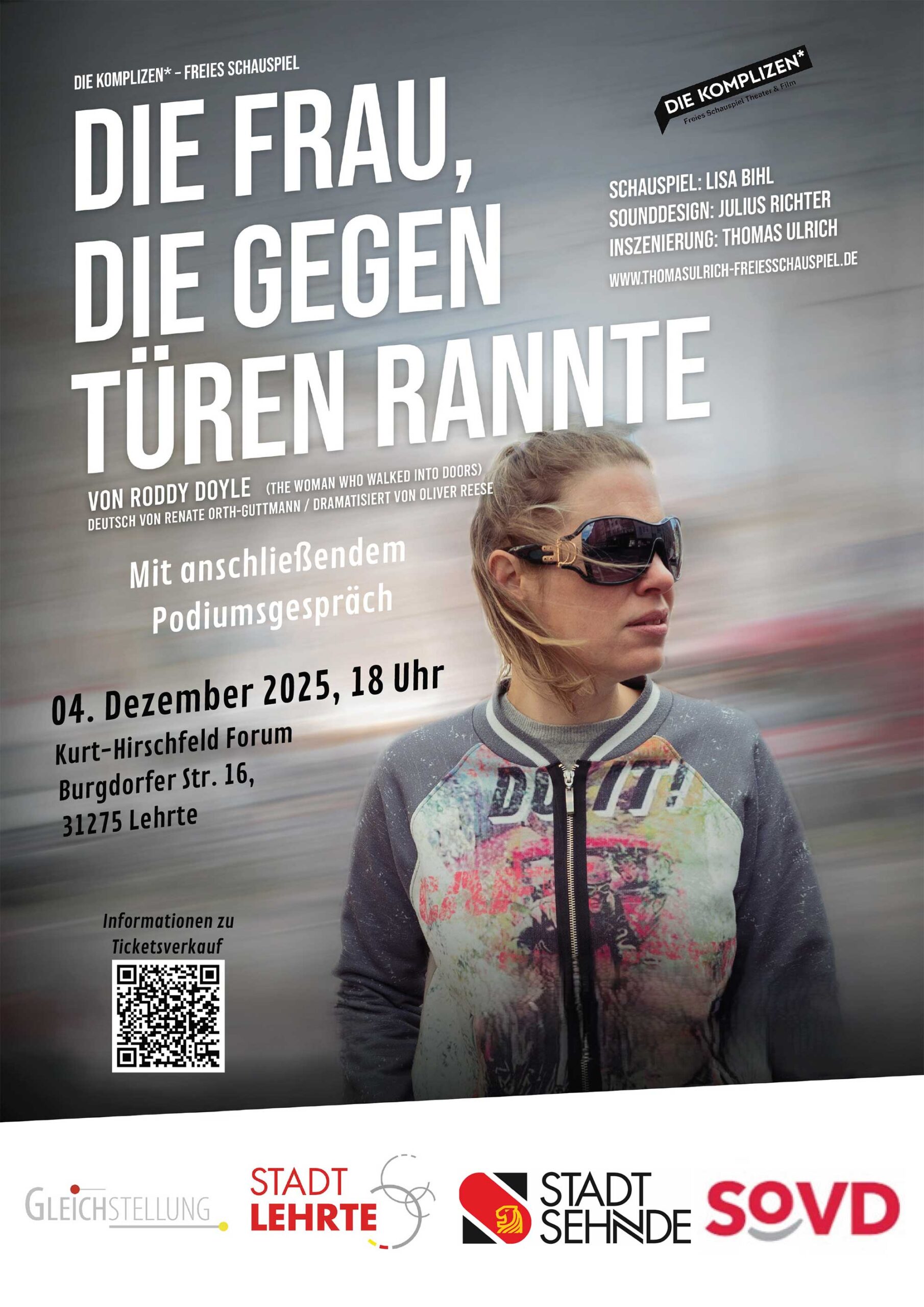 Ein weiterer Programmpunkt folgt am Donnerstag, 4. Dezember, um 18 Uhr im Kurt-Hirschfeld-Forum in der Burgdorfer Straße 16 in Lehrte. Dort wird das Theaterstück „Die Frau, die gegen Türen rannte“ gezeigt, geschrieben vom Booker-Preisträger Roddy Doyle. Die Inszenierung erzählt die Geschichte der 39-jährigen Paula Sprenger, deren Leben trotz aller Bemühungen über viele Jahre hinweg von häuslicher Gewalt geprägt ist. In einem eindringlichen Monolog berichtet sie über ihre Ehe mit ihrem Mann Karl, die Jahre der Misshandlungen, ihre vier Kinder und den Weg in den Alkohol, der ihr als vermeintlicher Ausweg diente. Das Stück zeigt den Kampf einer Frau, die trotz aller Rückschläge versucht, ihr Leben aus eigener Kraft zu bewältigen.