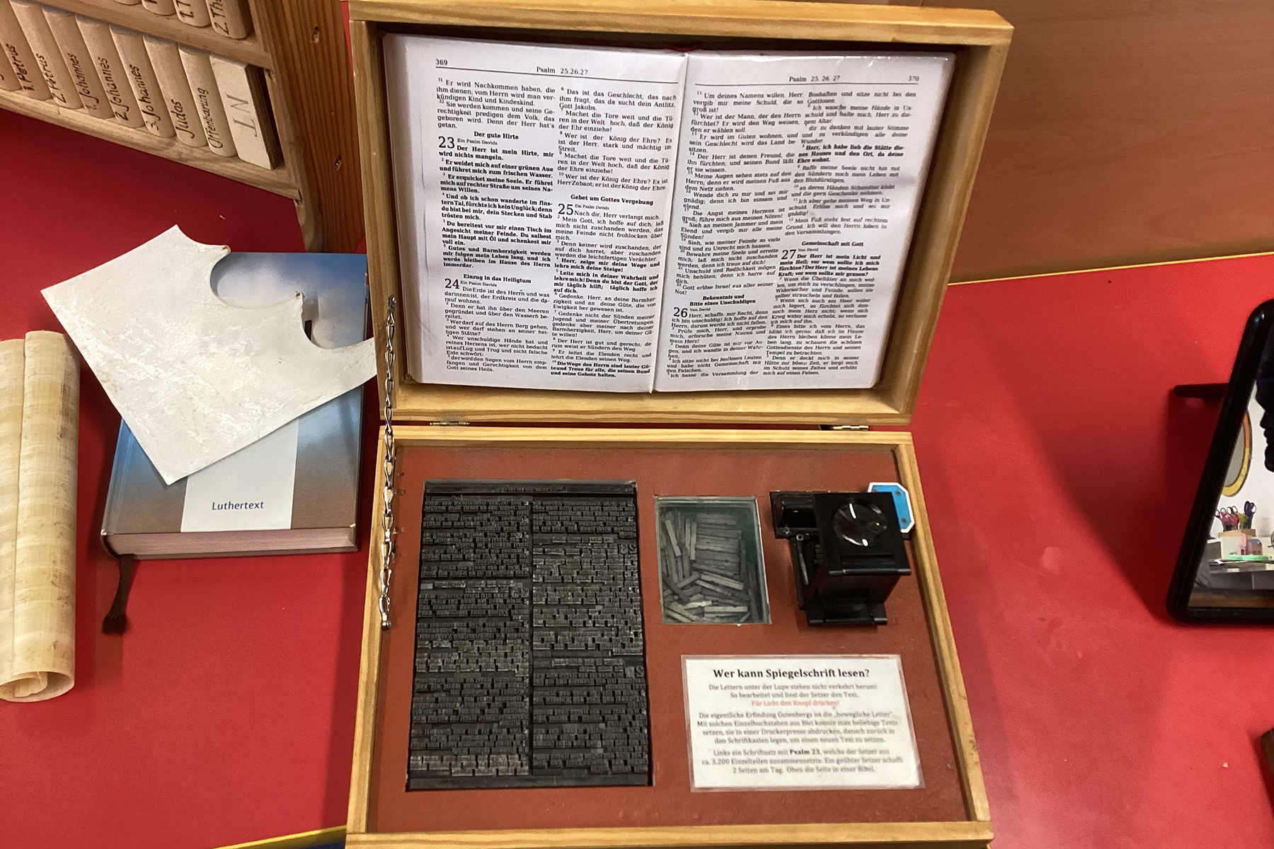 Ein absolutes Highlight war für viele Kinder die Gutenbergpresse. Mit viel Neugier und Begeisterung durften alle selbst aktiv werden und eine Seite mit einem Psalm drucken. „Das war cool, weil man richtig arbeiten musste“, meinte ein Schüler stolz und hielt sein gedrucktes Blatt in den Händen. Ein anderes Kind staunte: „Jetzt weiß ich, wie schwer und langwierig das früher war, ein Buch herzustellen.“