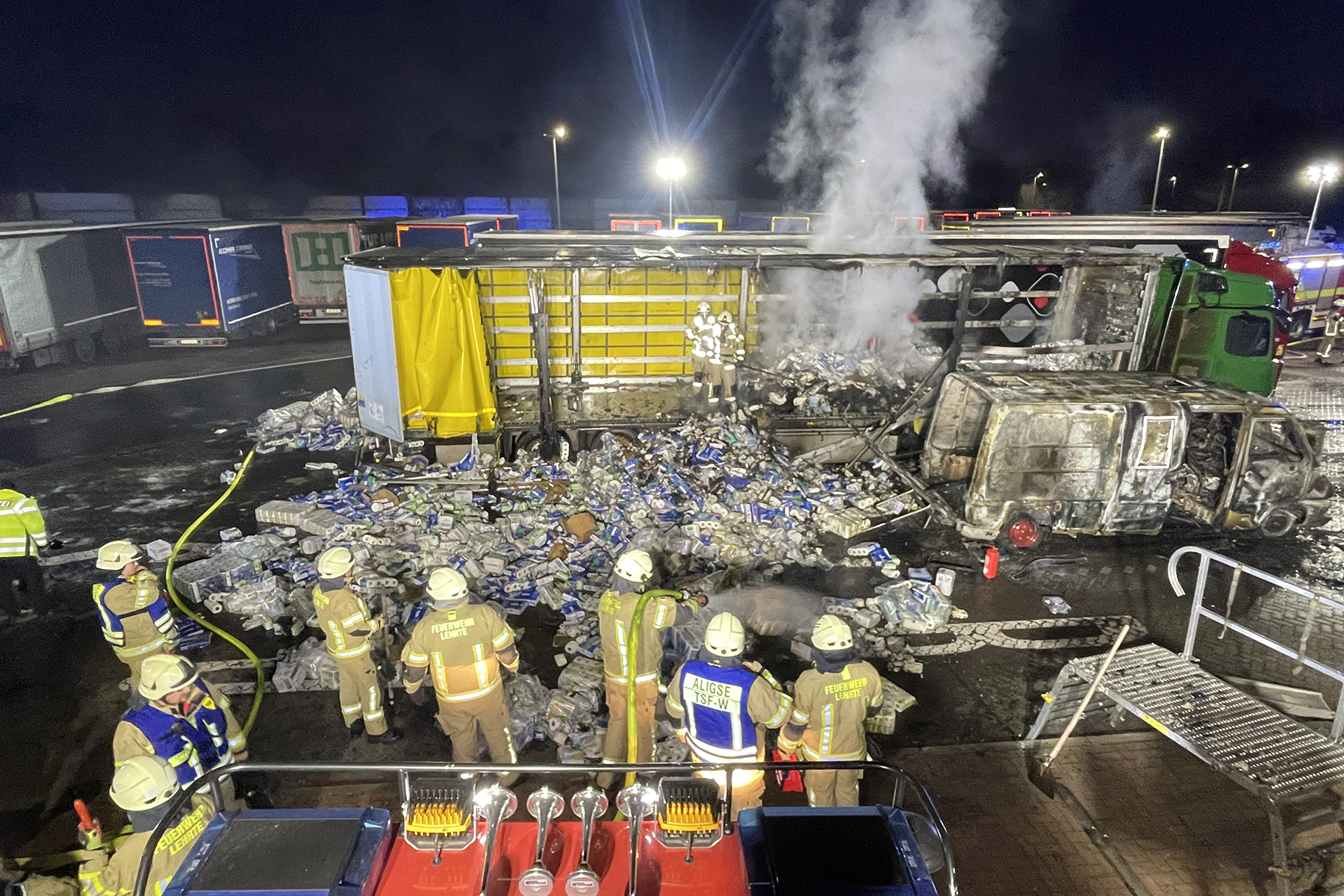Der Transporter sowie der direkt daneben stehende Sattelzug mitsamt Auflieger und Zugmaschine wurden durch das Feuer teilweise vollständig zerstört beziehungsweise erheblich beschädigt. Durch das schnelle und koordinierte Eingreifen der Feuerwehr konnte jedoch verhindert werden, dass auch der dritte Sattelzug in Brand geriet.