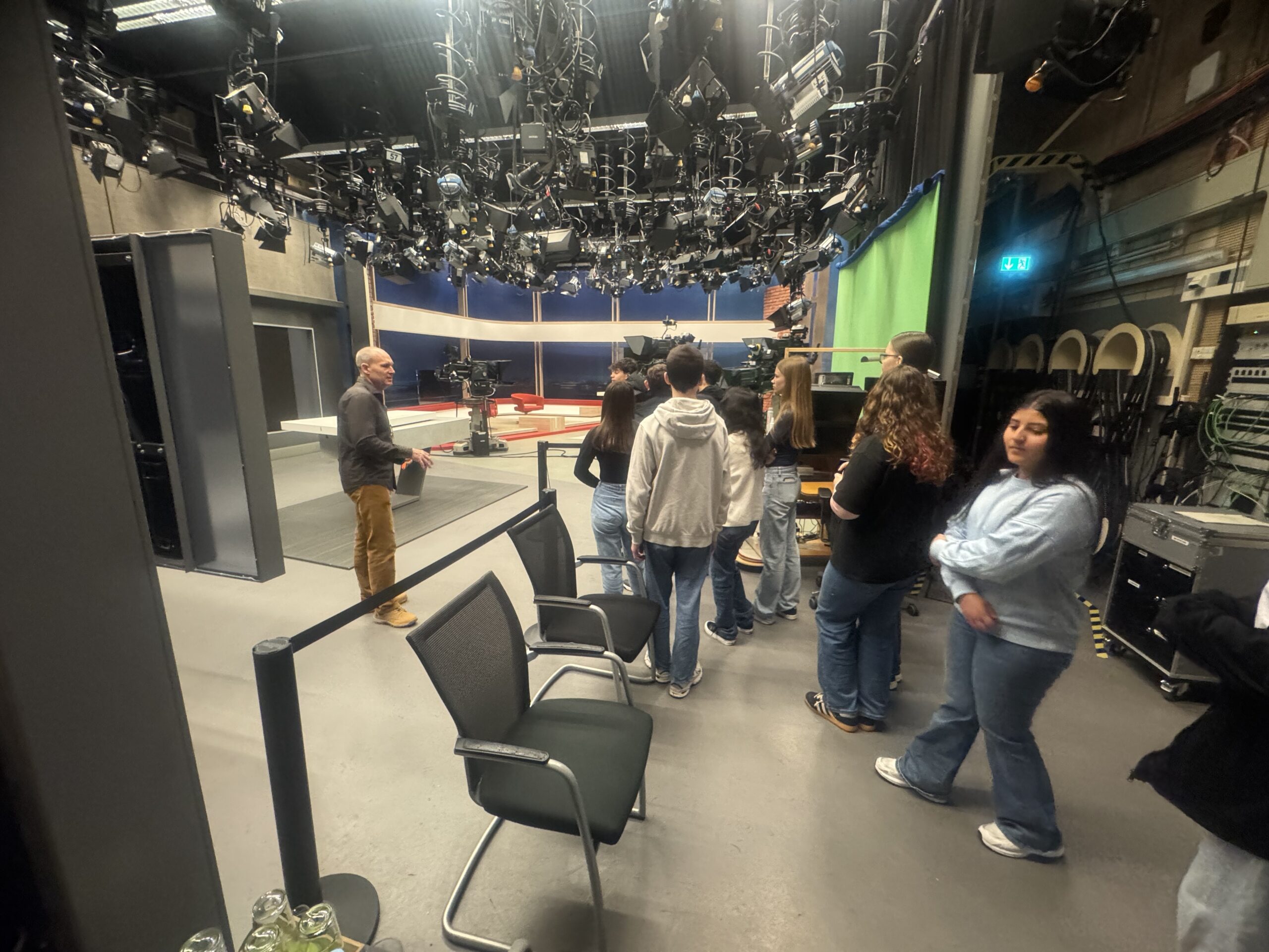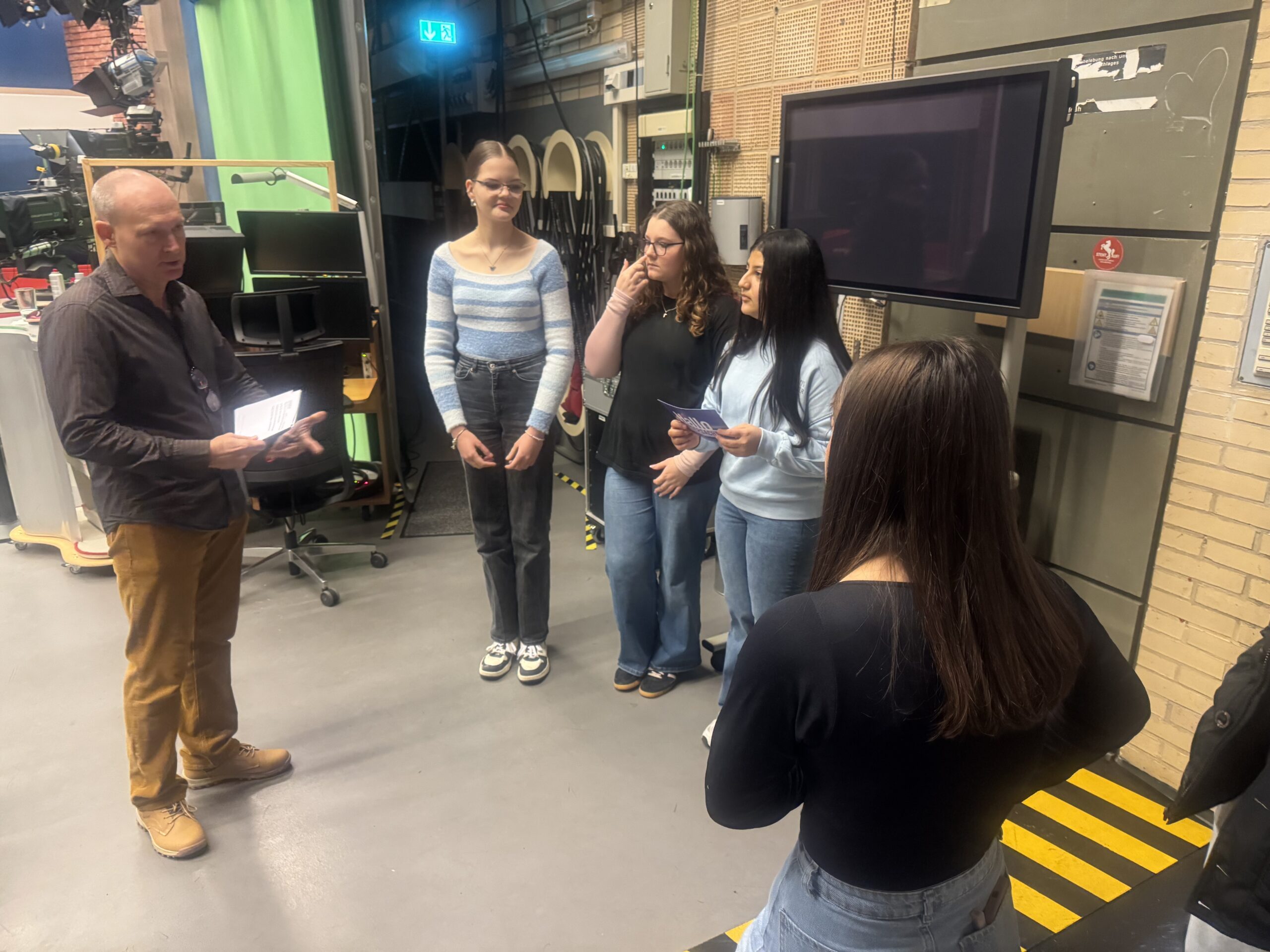 Weiter ging es ins Fernsehstudio von „Hallo Niedersachsen“. Dort beeindruckten zahlreiche Scheinwerfer, Kameras und ein Green-Screen die Gruppe. Besonders beliebt waren die originalen Moderationskarten, die die Schülerinnen und Schüler als kleine Erinnerung mitnehmen durften. Die Themen reichten dabei von regionalen Kriminalfällen bis hin zu internationalen Nachrichten wie der politischen Lage im Iran.