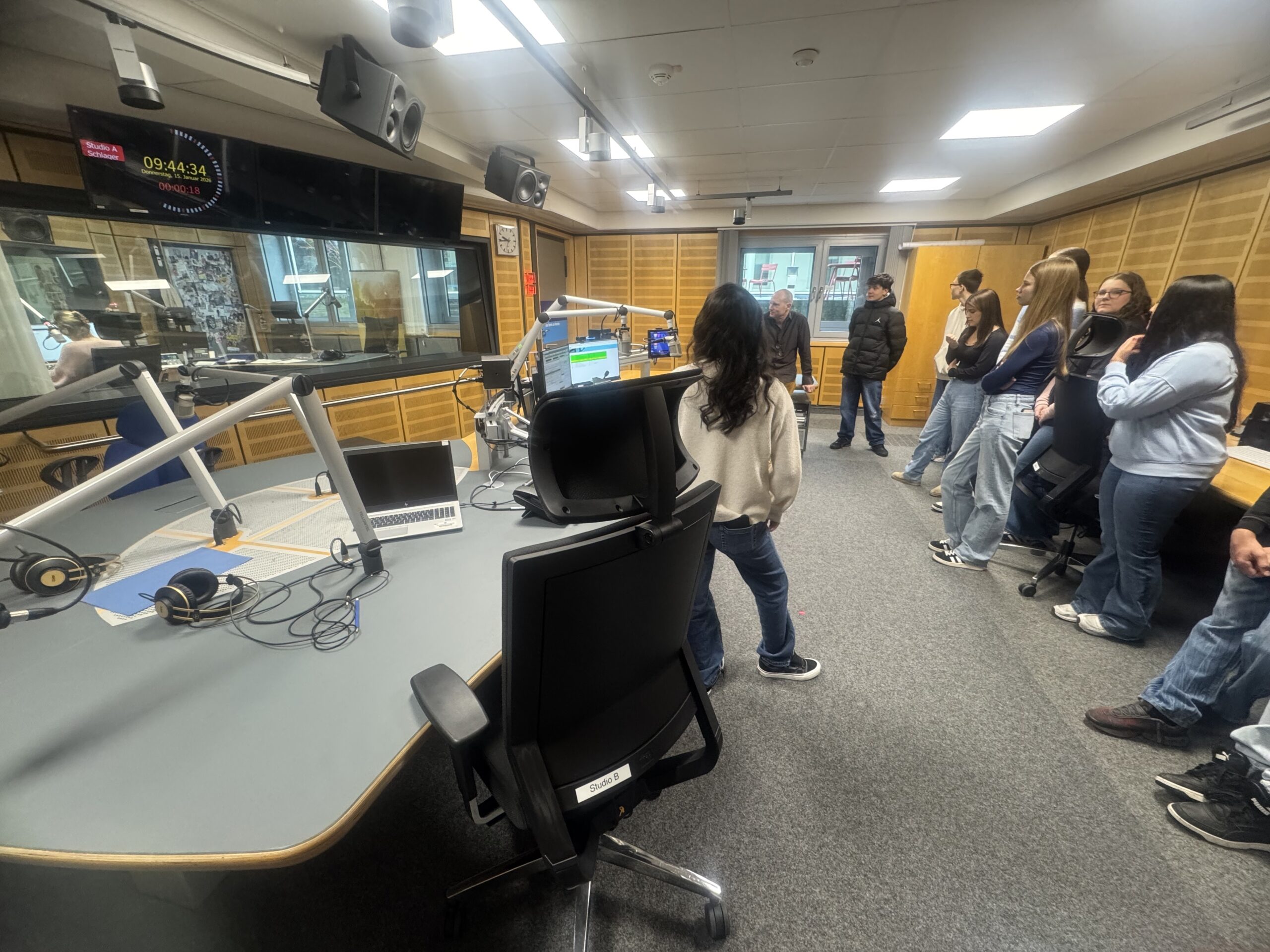 Anschließend durften die Schülerinnen und Schüler live bei einer Radiosendung dabei sein. Sie verfolgten die Sendung „Die schönsten Schlager von gestern und heute“ mit Moderatorin Silke Liniewski – inklusive eines Gewinnspiels. Während der angerufene Kandidat das Lied „Die berühmten drei Worte“ von Andy Borg sofort erkannte, sorgte der Schlager bei den Jugendlichen eher für fragende Blicke und Schmunzeln.