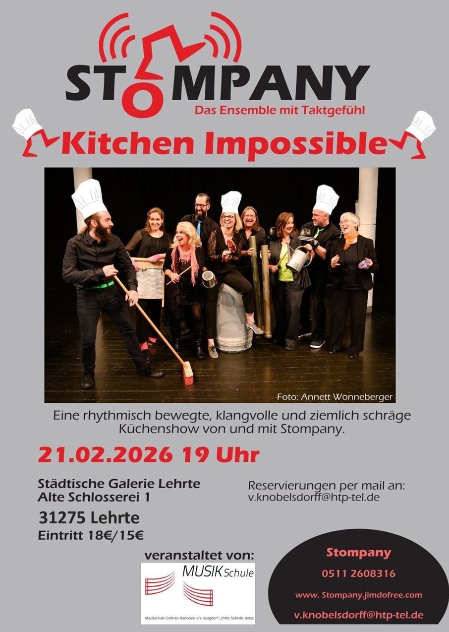 Auf Einladung der Musikschule Ostkreis Hannover gastiert das Ensemble Stompany am Sonnabend, 21. Februar 2026, um 19 Uhr mit seinem neuen Programm in der Städtischen Galerie in Lehrte. Das Publikum darf sich auf eine rhythmisch bewegte, klangvolle und mitunter schräge Küchenshow freuen.