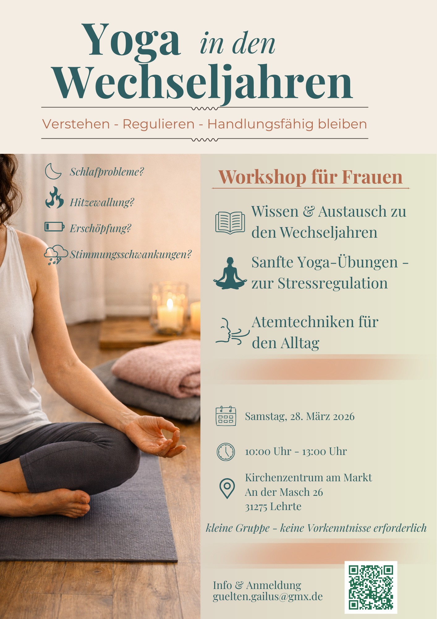 Am Sonnabend, 28. März 2026, wird im Kirchenzentrum am Markt in Lehrte erstmals der Workshop „Yoga in den Wechseljahren“ angeboten. Das dreistündige Angebot findet von 10 bis 13 Uhr statt.