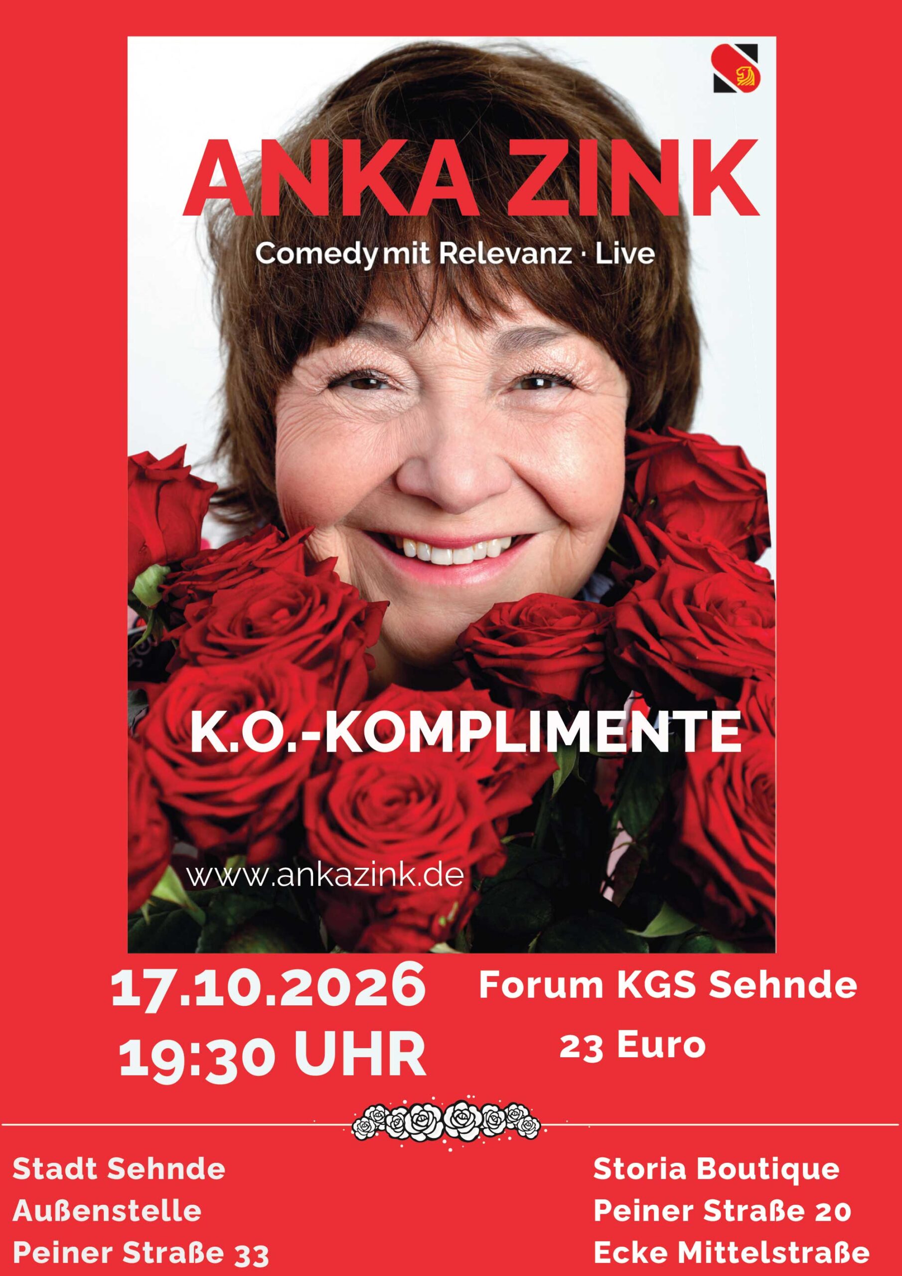 Anka Zink steht seit vielen Jahren auf deutschen Kabarettbühnen und ist regelmäßig mit eigenen Programmen im ganzen Bundesgebiet unterwegs. Mit ihrem Auftritt unterstreicht die Stadt Sehnde erneut das Ziel, ein abwechslungsreiches und hochwertiges Kulturangebot für die Region zu schaffen.