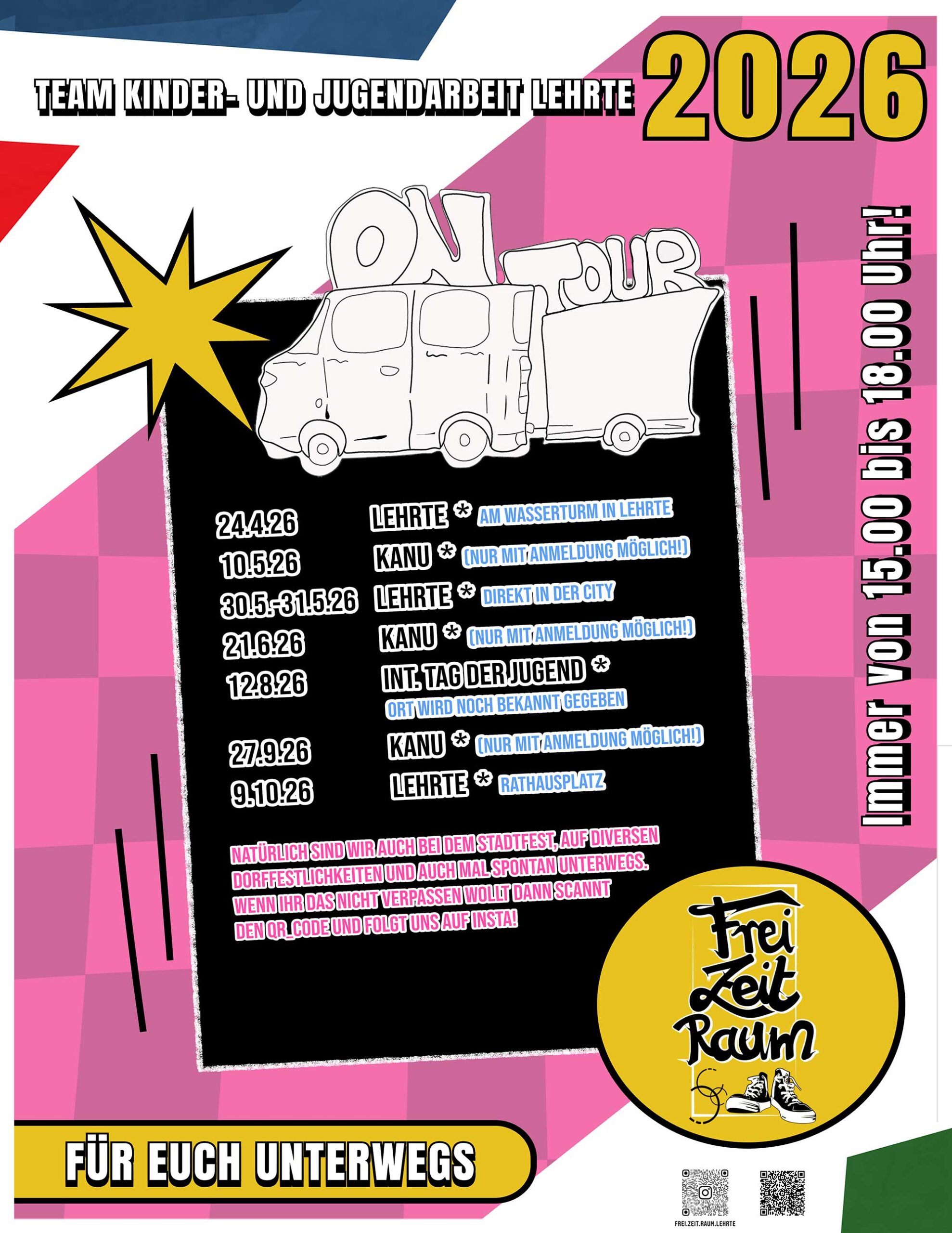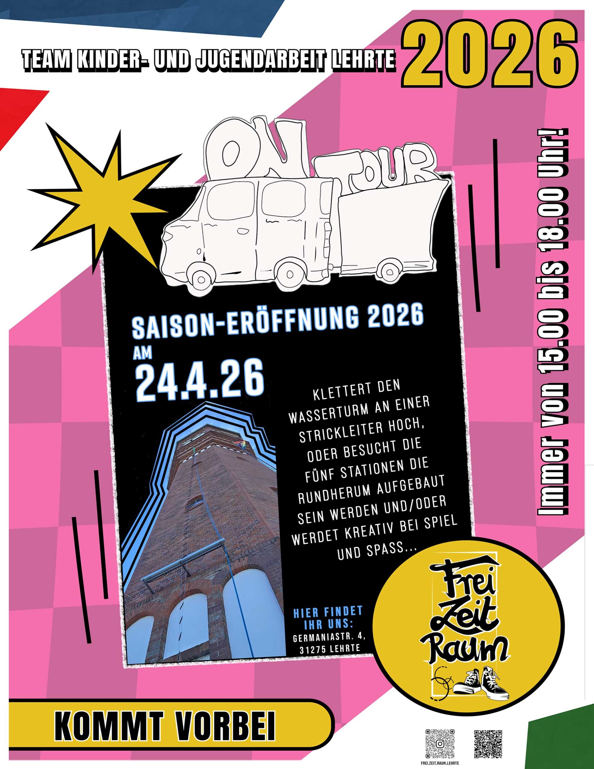 Der Auftakt zu der diesjährigen Veranstaltungsreihe findet am Freitag, 24. April 2026, in der Zeit von 15.00 bis 18.00 Uhr am Wasserturm in Lehrte statt. Das Angebot wird bunt und vielseitig sein: An fünf Stationen können Kinder und Jugendliche krökeln, Säckchen werfen, Dosen werfen, Buttons gestalten oder auch den Wasserturm an einer Strickleiter erklimmen.